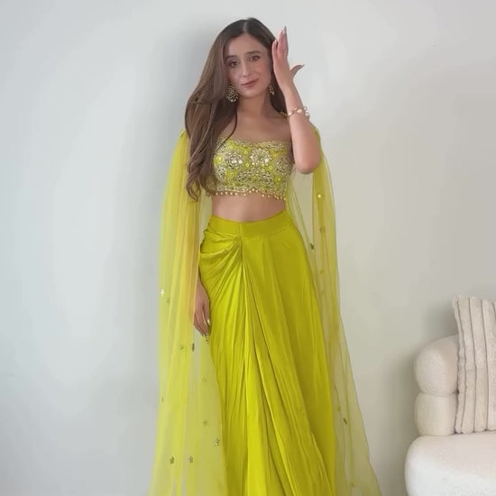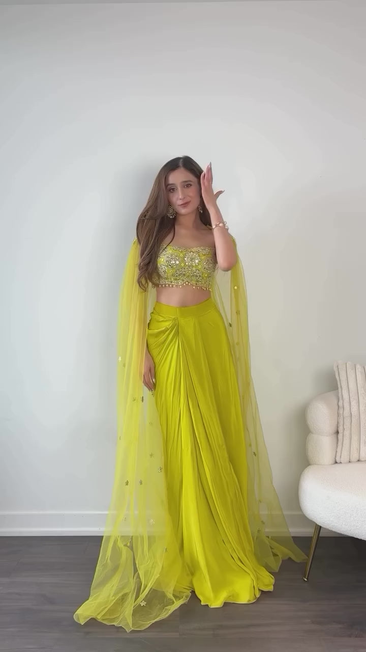 Citrus Green Draped Skirt & Embroidered Blouse with Cape | Elegant Mirror Work