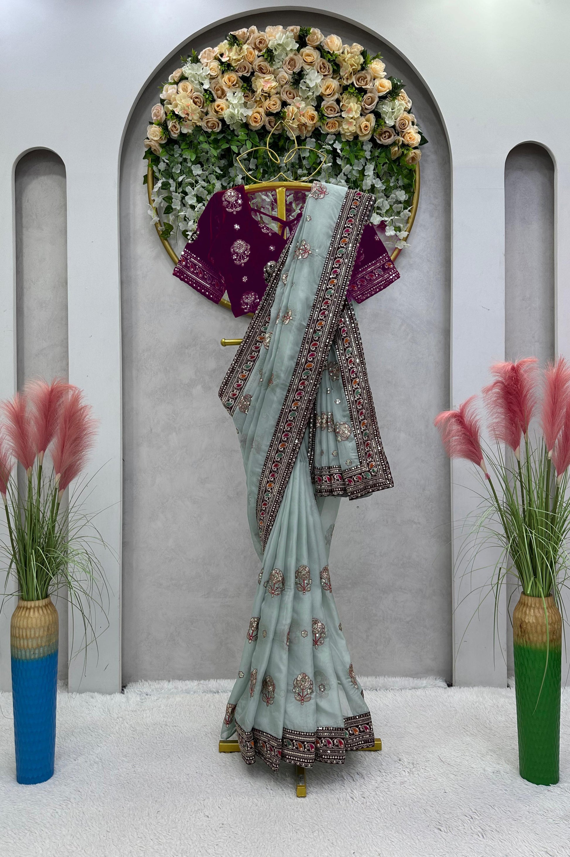 "Elegant Organza Silk Designer Saree with Thread & Sequin Work and Velvet Blouse"