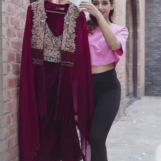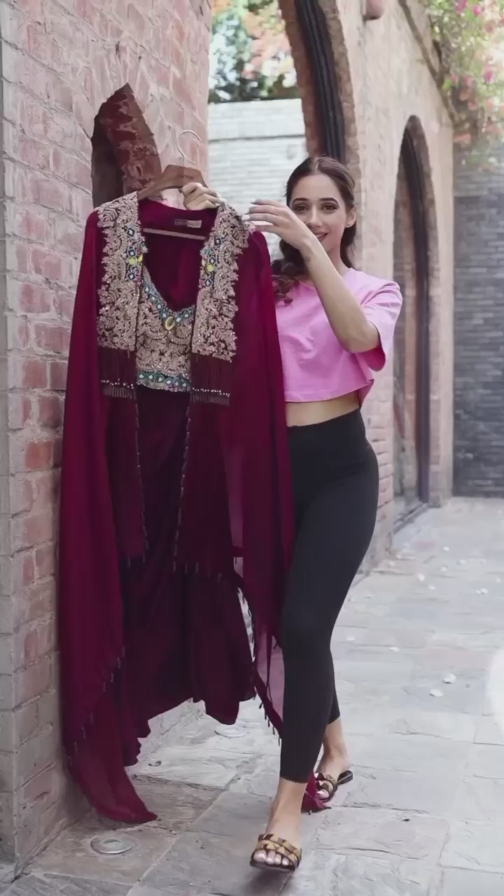 Embrace the allure of Organza Silk with this exquisite Designer Dhoti Set. The elegant Wine color combined with the detailed Sequin and Thread work ensures you will stand out at any event.