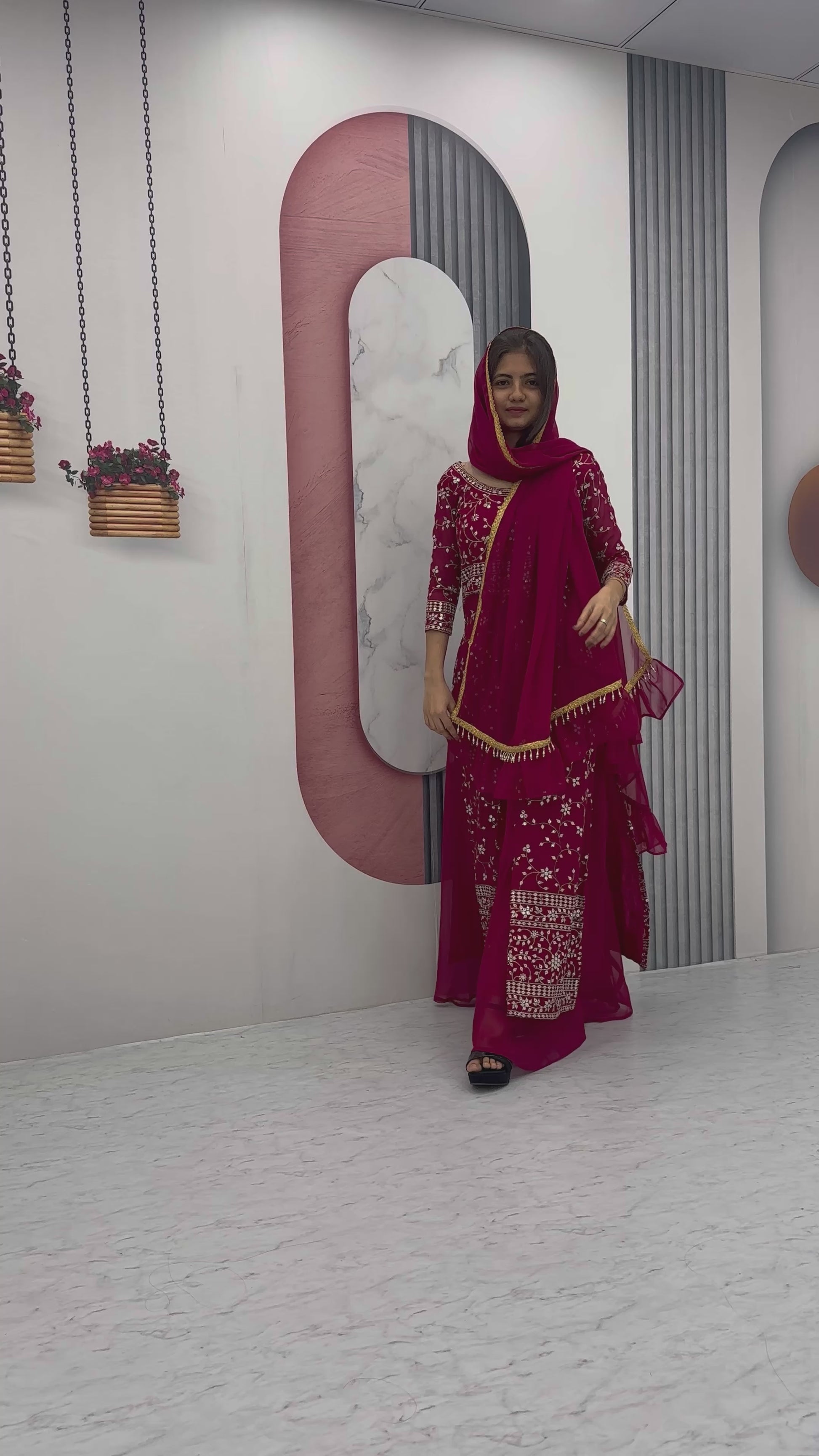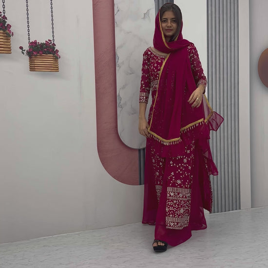 Elevate your style with our stunning Maroon Embroidered Plazzo Top Set with Dupatta, crafted from luxurious Heavy Fox Georgette fabric.