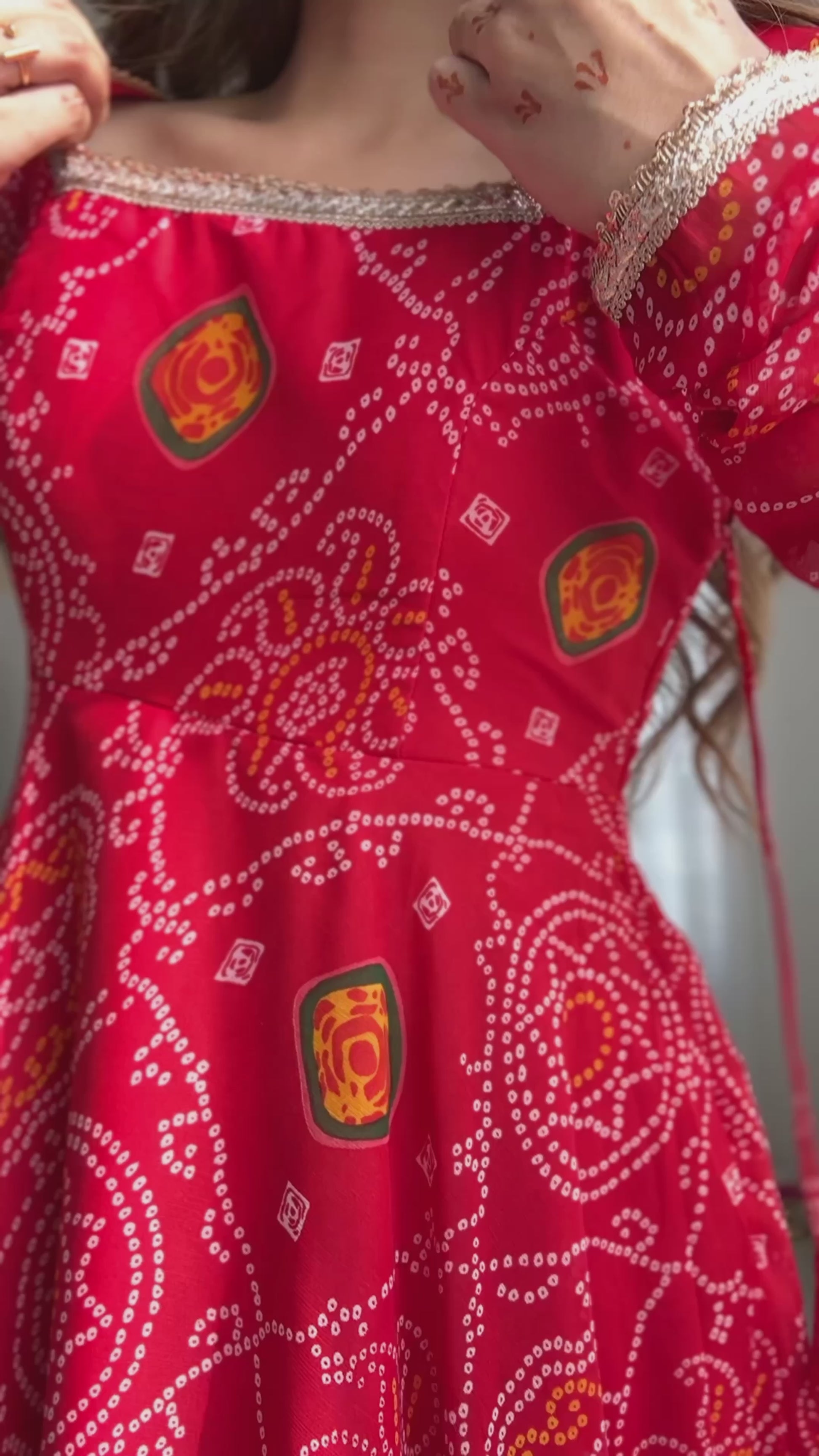 Introducing our Designer Pure Soft Chiffon Bandhej Anarkali Gown Set, a graceful ethnic outfit crafted for festive elegance and all-day comfort. Made from lightweight chiffon Bandhej fabric, this full-length Anarkali gown features an 8-meter flair, fancy yoke lace work, churidar sleeves, padded bust, and a side zipper for a perfect fit.