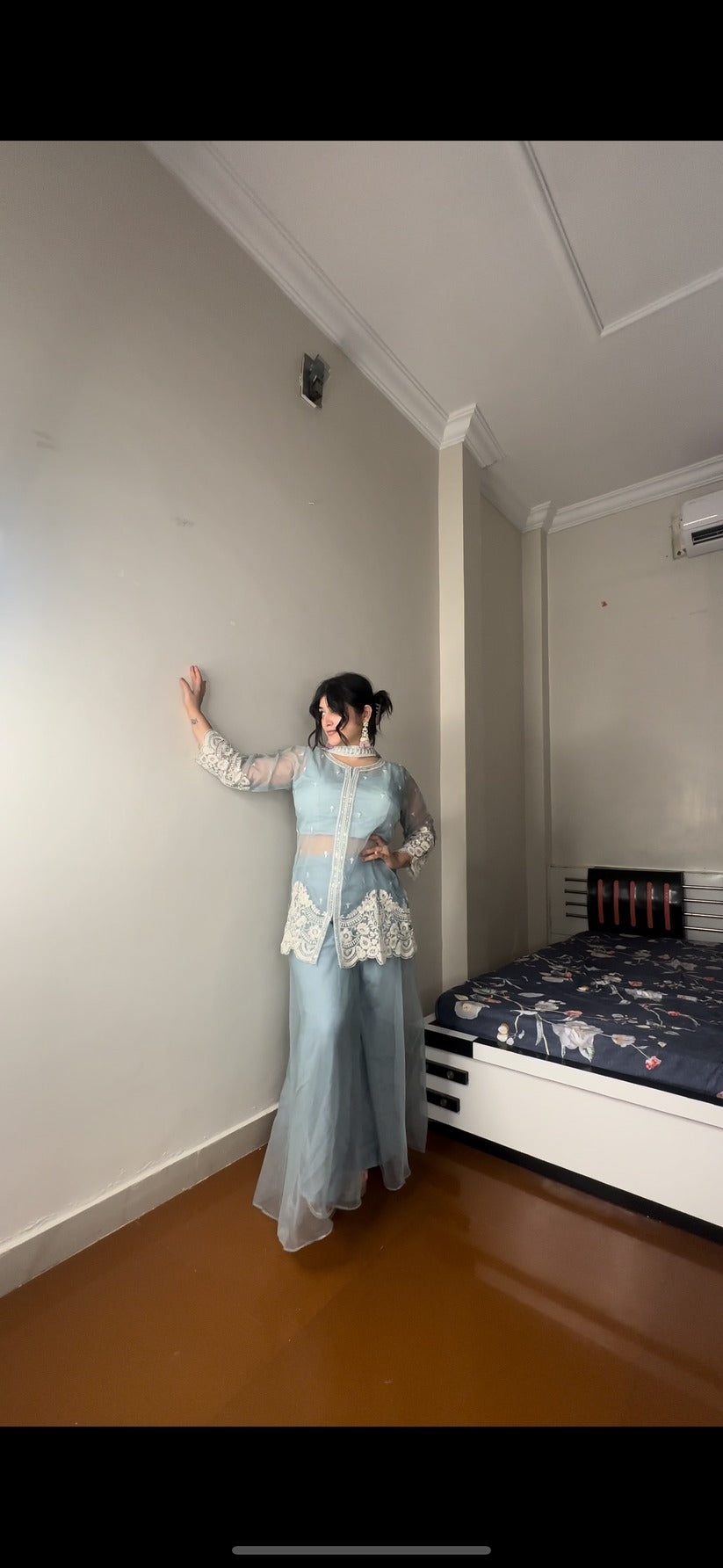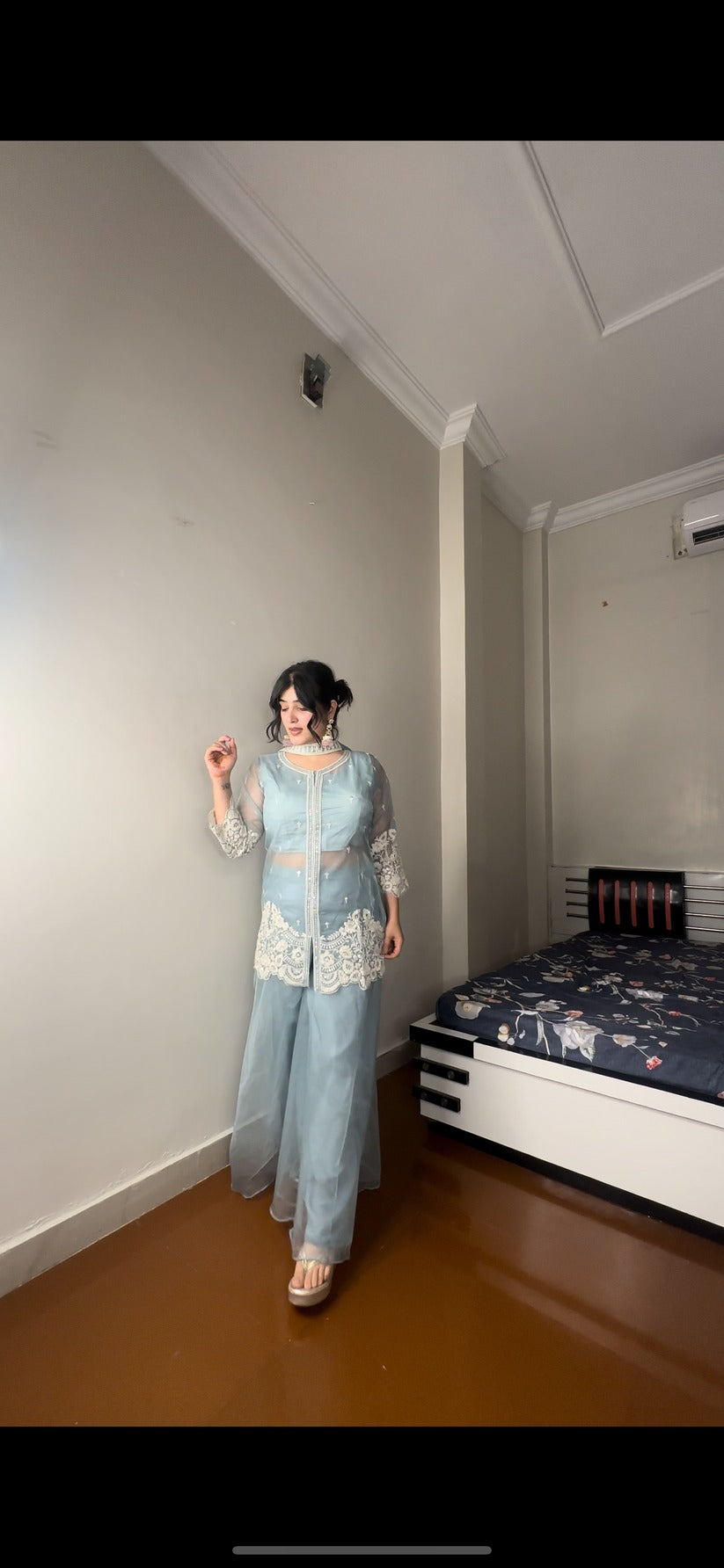 | Plazo | Full-Stitched Plazo in Organza – Stylish and flattering fit for a graceful silhouette. |
